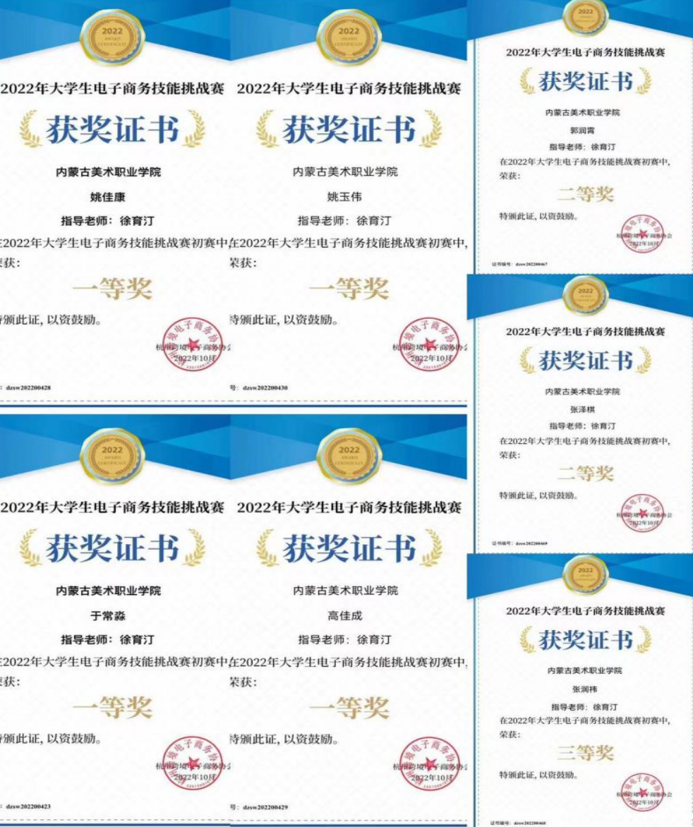 基础工作室多为理论课程,课堂的趣味性、知识性、竞技性是培养学生创新能力的“重中之重。”趣味性让他们主动参与,知识性让他们对所学记得更加牢固,竞技性让他们多参加竟能比赛,参加的过程让他们更加明白自己所学专业。在2022-2023学年第一学期中我院2022级三年制电子商务班学生参加了2022年大学生电子商务技能挑战赛和第六届全国跨境电商专业能力大赛,均取得好成绩。