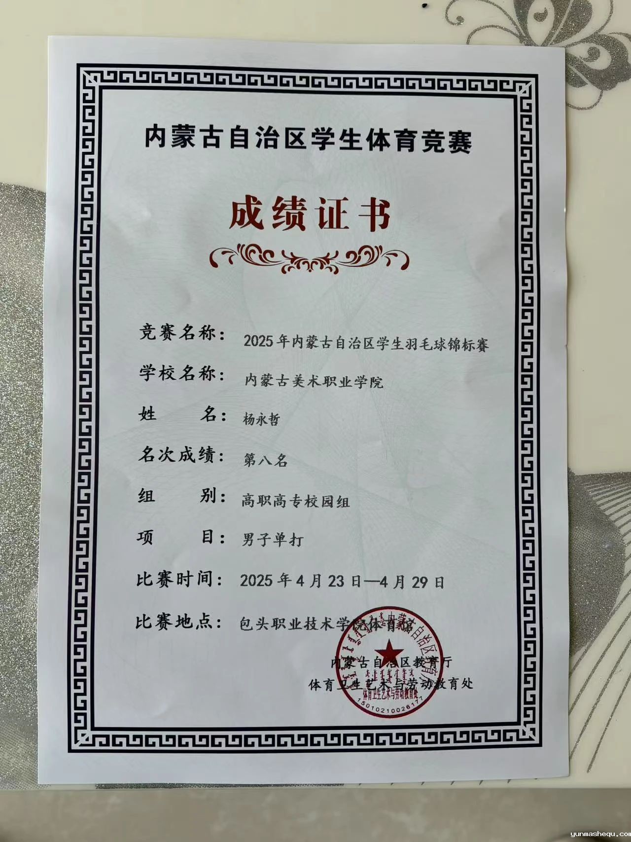 2025年4月23日至29日,内蒙古自治区学生羽毛球锦标赛隆重举行,我院学子积极响应自治区体育赛事号召,以昂扬的斗志和出色的表现参与角逐。经过激烈的比拼,我院绘画与设计学院学生杨永哲凭借精湛的技艺与顽强的拼搏精神,在比赛中脱颖而出,荣获男子单打第八名的优异成绩!